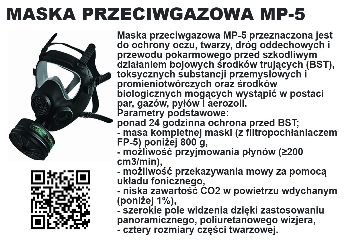 Filtracyjna maska przeciwgazowa MP-5 z filtropochłaniaczem przeznaczona jest do ochrony oczu, twarzy, dróg oddechowych i przewodu pokarmowego przed szkodliwym działaniem bojowych środków trujących (BST), toksycznych substancji przemysłowych i promieniotwórczych oraz środków biologicznych mogących wystąpić w postaci par, gazów, pyłów i aerozoli.